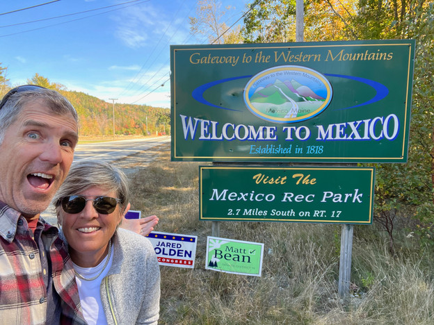 Mexico, Maine & a very large Paul Bunyon. There are fun sites wherever we go and these are just two of our Maine favorites. Randy especially wanted to take a pic in Mexico for some of his students back home.