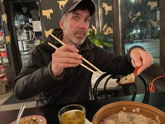Our first meal, Beer and Pasta, led to our first use of the bathroom. Joan was a good sport to pose here!